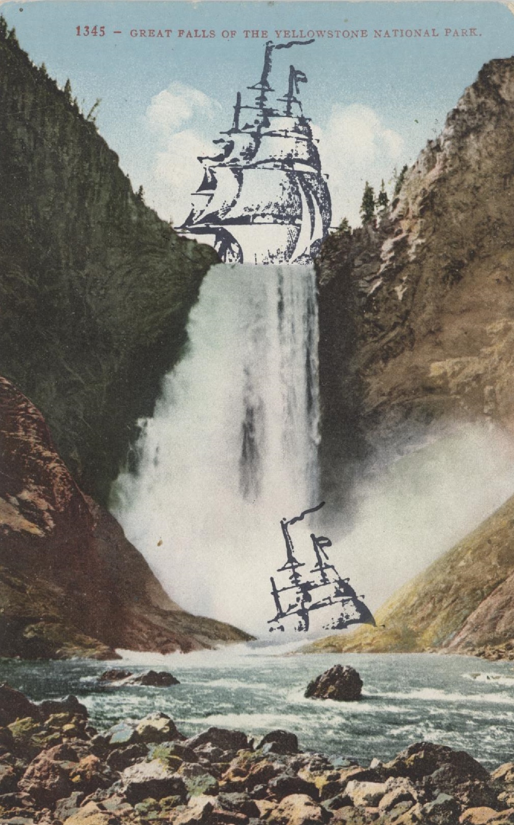 I don’t know if I invented the art form of rubber-stamping on old postcards, but I may have been the first person to write about it (Rubberstampmadness, 1993). Today’s card was published in the 1920s. I used extra thin paper to mask the ship’s hull. I only wanted the sails and rigging. Any resemblance between this image and my government’s economic policy is coincidental.