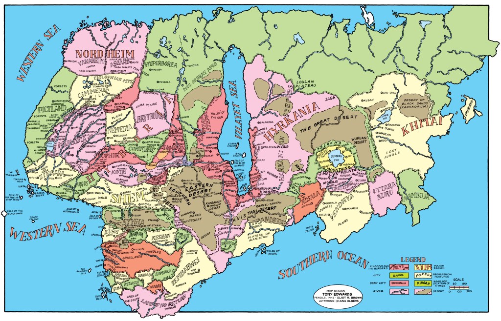 I soon gave up on Conan, as the formula was too predictable and there were so many writers listed on these things that they felt like a committee or a football club. I’m fairly sure I read Conan the Freebooter and probably Conan the Bootscooter. Howard’s writing was serviceable, certainly on a par with Andre Norton, though I note that Ms. Norton wrote her own books and didn’t require the 14 relief pitchers listed in Conan’s Wikipedia entry. But I never gave up on that map (and that essay).