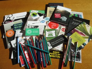 The only day I had was Saturday, and the only time I had covered 0.75 expos, three panels, and one reading (female science fiction writers of the Northwest). What follows is my report, with tips on writing. But first: Merch!